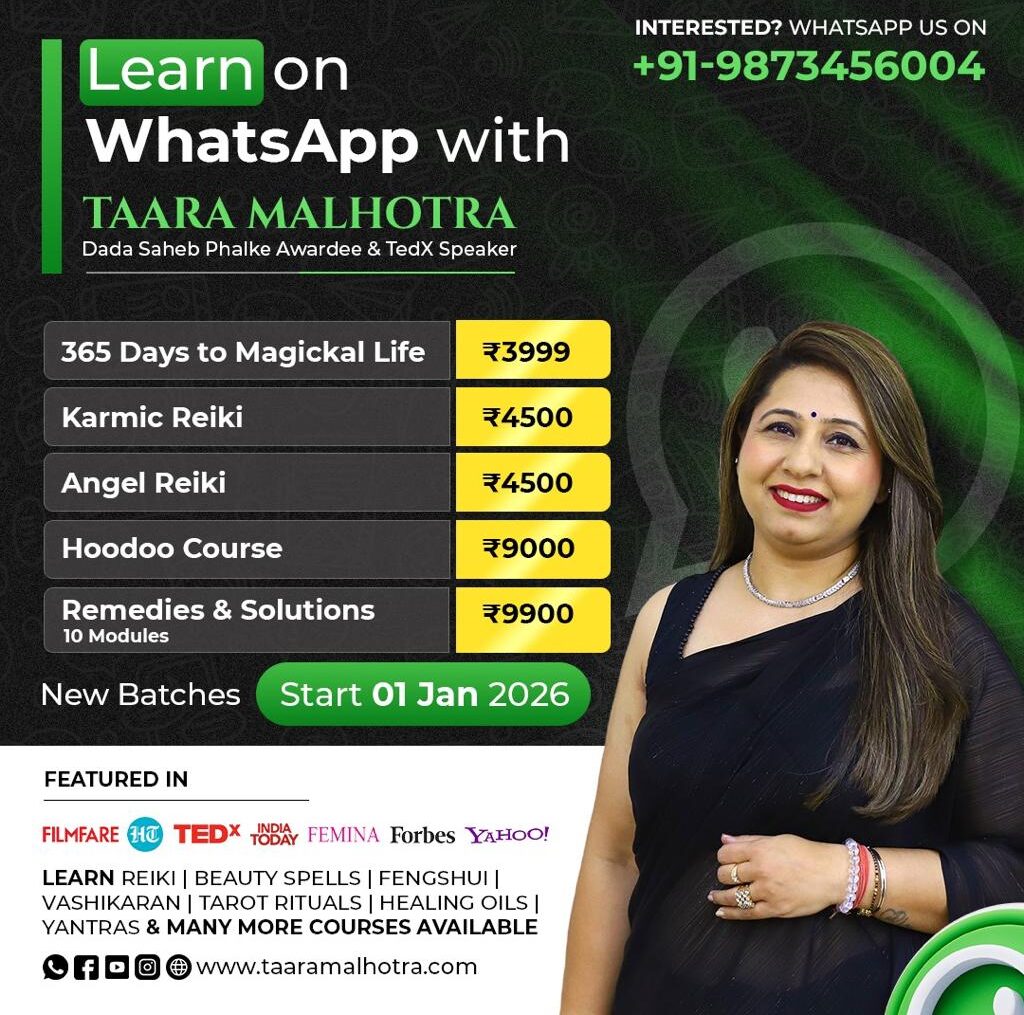 Train under Taara Malhotra, an internationally recognised spiritual teacher with 20+ years of practice in Akashic channeling, ritual magick, Hoodoo, and energy healing. Her WhatsApp courses deliver bite-sized, practice-focused lessons distilled from decades of client work and classroom training.